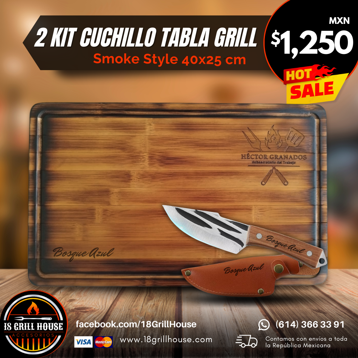 • GRÁTIS Sin costo adicional personalizado, grabado a láser de TODOS los accesorios: cuchillos y fundas y tabla parrillera.